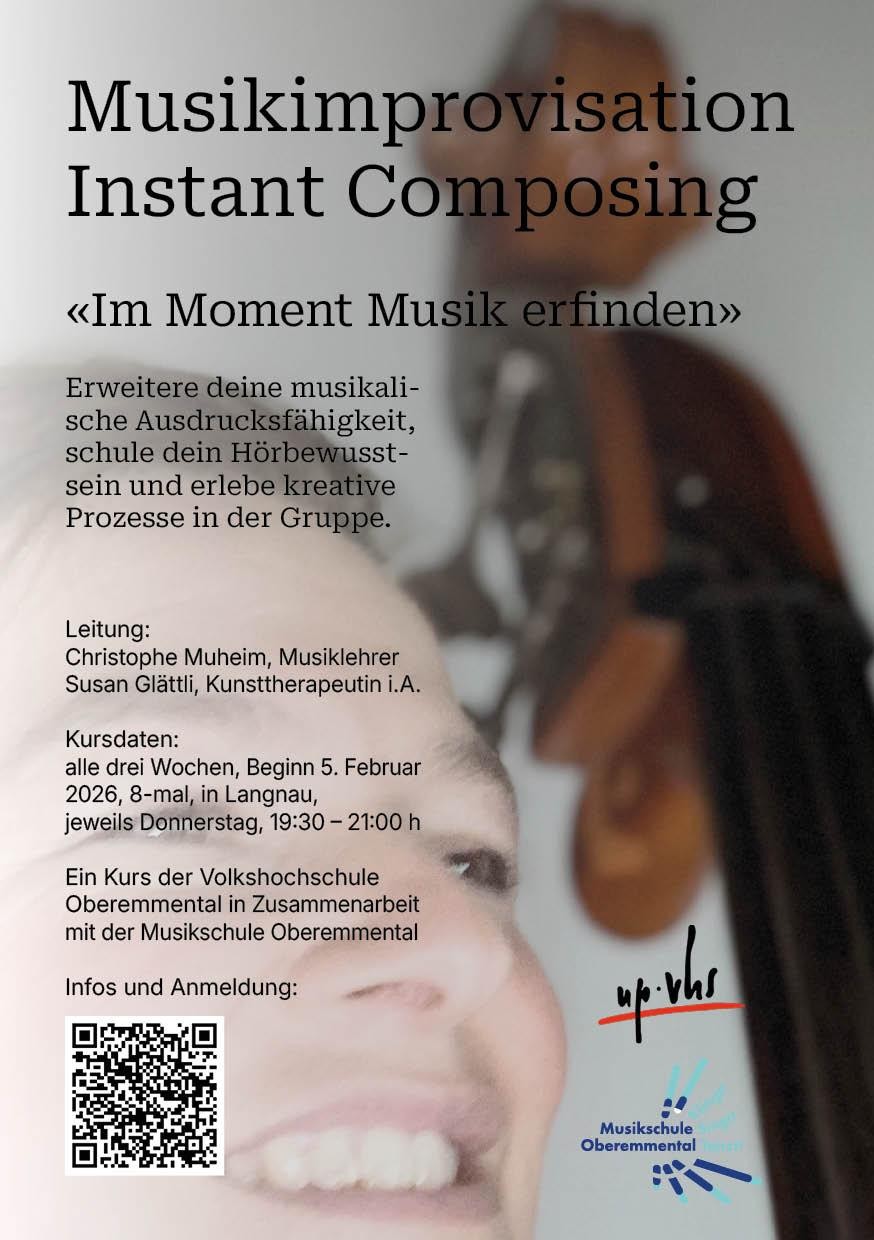 Der Kurs «Instant Composing» bietet Erwachsenen die Möglichkeit, Musik spontan zu erfinden – im Moment, ohne Vorbereitung, aus dem Nichts oder aus einem gemeinsamen Impuls heraus. Die Teilnehmenden erweitern ihre musikalische Ausdrucksfähigkeit, schulen ihr Hörbewusstsein und erleben kreative Prozesse in der Gruppe. Voraussetzung für die Teilnahme sind Grundkenntnisse auf dem eigenen Instrument.